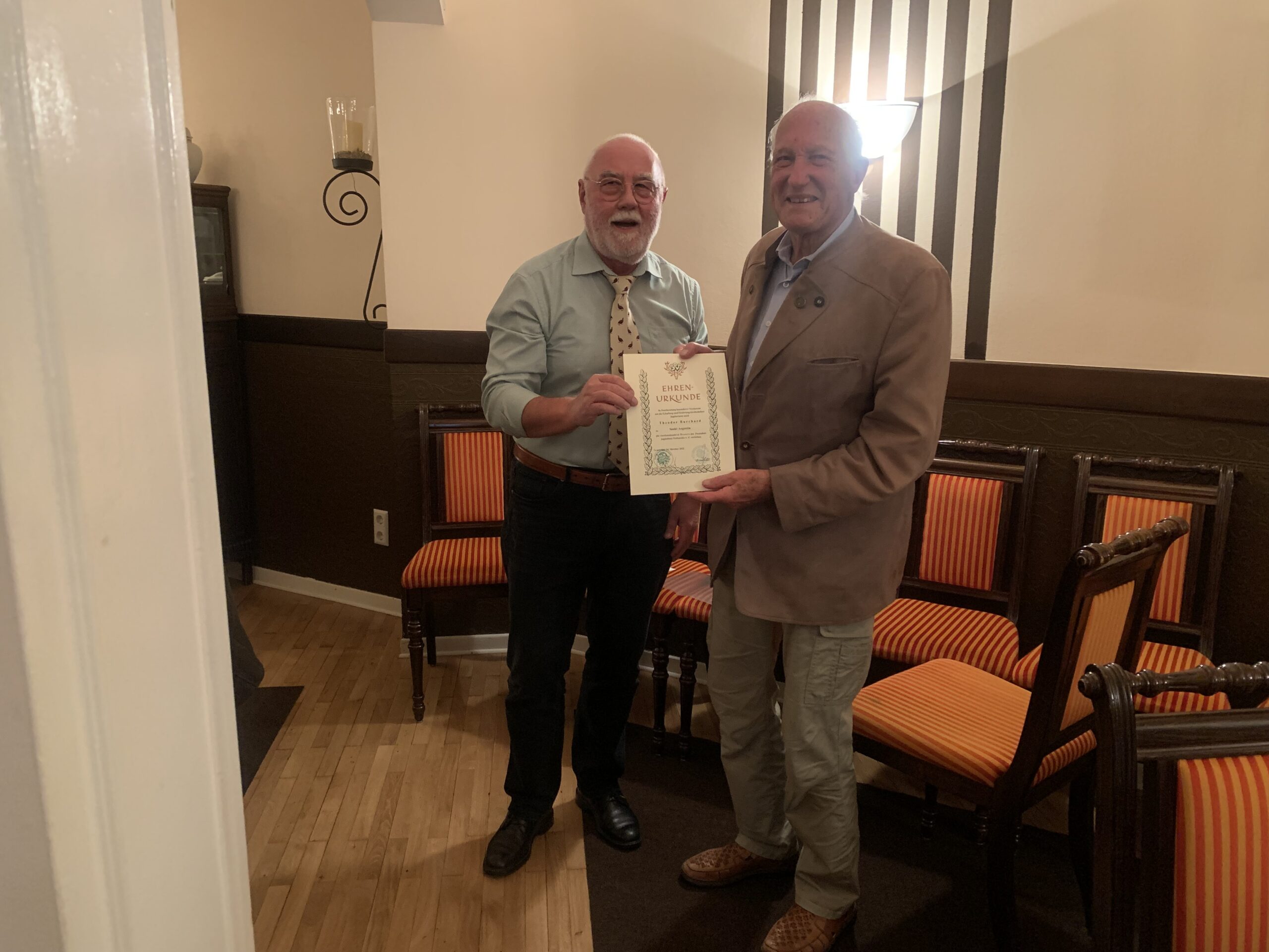 Am 24.10. überreichte der Vorsitzende der Kreisjägerschaft Dr. Heiner Nöllgen das Bronze Verdienstabzeichen des DJV an unseren langjährigen Hegeringleiter Theo Burchard. In seiner Rede würdige Dr. Nöllgen den Einsatz von Herrn Burchard für die jagdlichen Belange im Allgemeinen aber insbesondere für seine Bereitschaft sich für den Hegering Flammersfeld einzusetzen. Besonders gewürdigt wurde die Bereitschaft von Herrn Burchard im Alter von 82 Jahren das Amt des Hegeringleiters ein zweites Mal zu übernehmen.