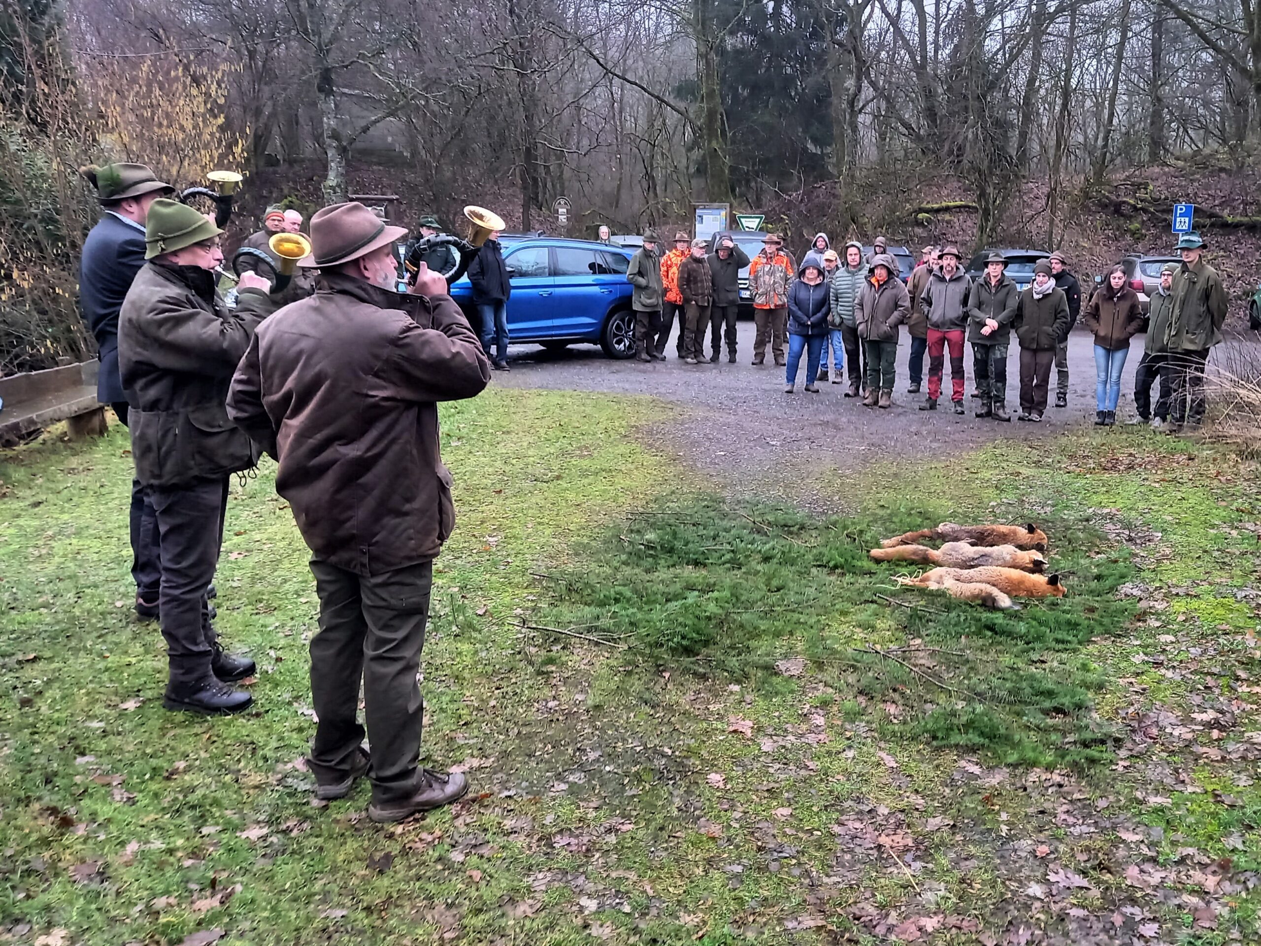 Zum Abschluss unserer traditionellen Raubwild-Jagdwoche trafen sich am Sonntag, den 5. Februar bei der Waldgaststätte Hohenseelbachskopf auf dem Köppel über 40 Jägerinnen, Jäger und Gäste zum gemeinsamen Streckelegen mit unserer Jagdhornbläsergruppe und anschließendem Frühstück in dem kleinen Lokal.
