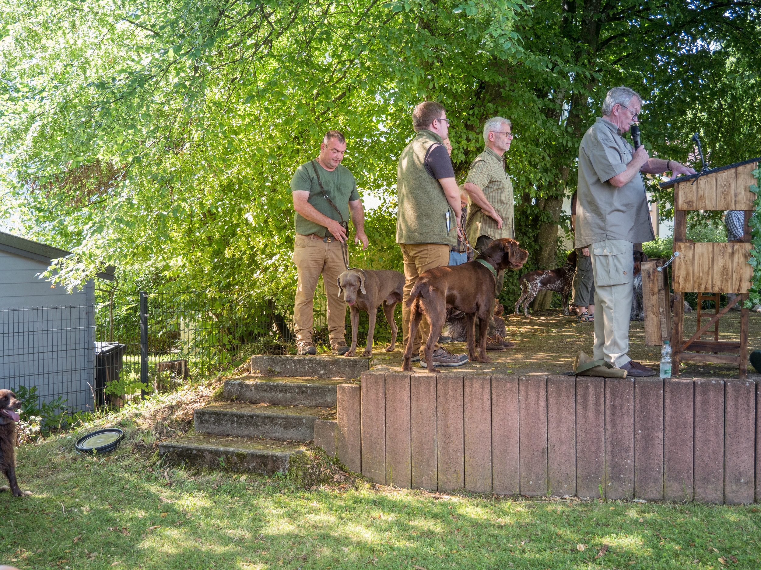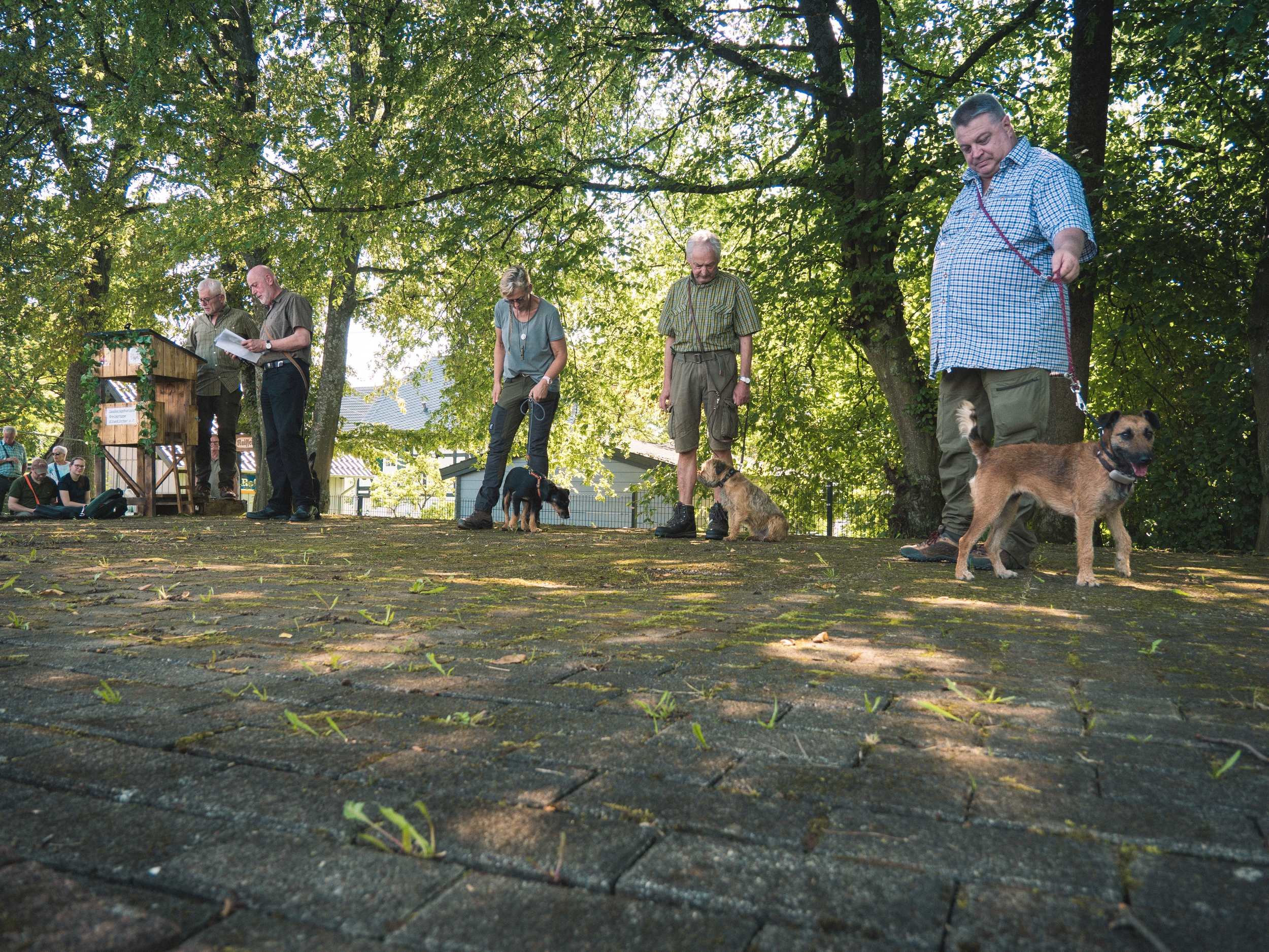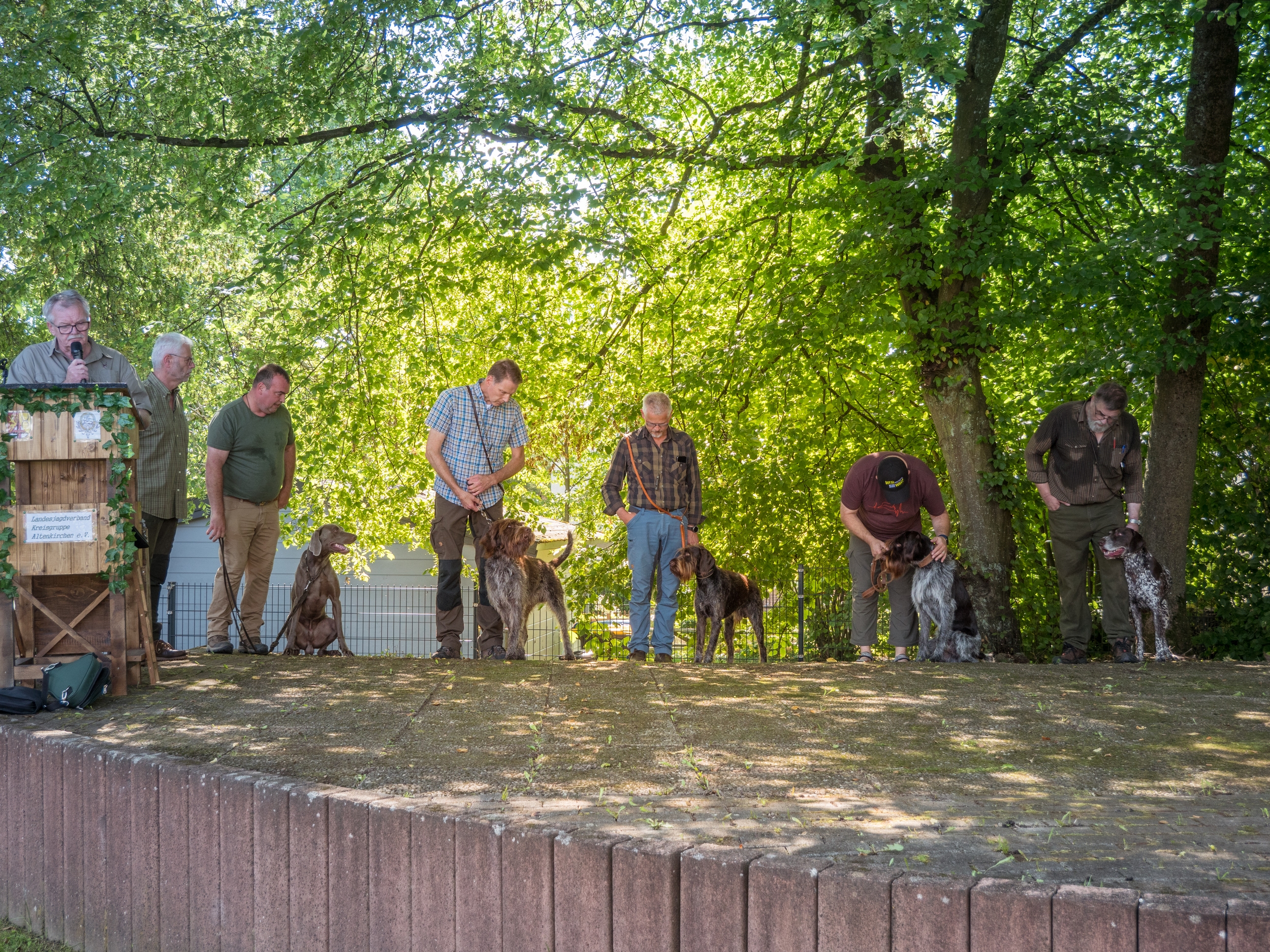 Bei der Pfostenschau 2023 am Bürgerhaus in Flammersfeld konnte die Kreisgruppe Altenkirchen e. V. bei einem Anwärterseminar das breite Spektrum der Jagdhunderassen präsentieren. Nach der Begrüßung durch den Kreisjagdmeister Jörg Wirths, den Vorsitzenden der Kreisgruppe Dr. Karl-Heiner Nöllgen sowie den Stellvertreter Frank Fischer, wurden über 50 Jagdhunde von ihren Hundeführern über die Naturbühne im Schatten der Bäume geführt, sortiert nach den speziellen Einsatzgebieten. Jede Gruppe hatte einen eigenen Moderator, der Wissenswertes über die gezeigte Jagdhunderasse berichtete. Für die erschienenen Jägerprüfungsanwärter und interessierten Hundefreunde war das eine sehr informative Veranstaltung, die durch die Walderlebnisschule mit zahlreichen Wildtierpräparaten ergänzt wurde. Die Bläsergruppe des Hegerings Altenkirchen sorgte für einen ansprechenden jagdmusikalischen Rahmen der Veranstaltung.
