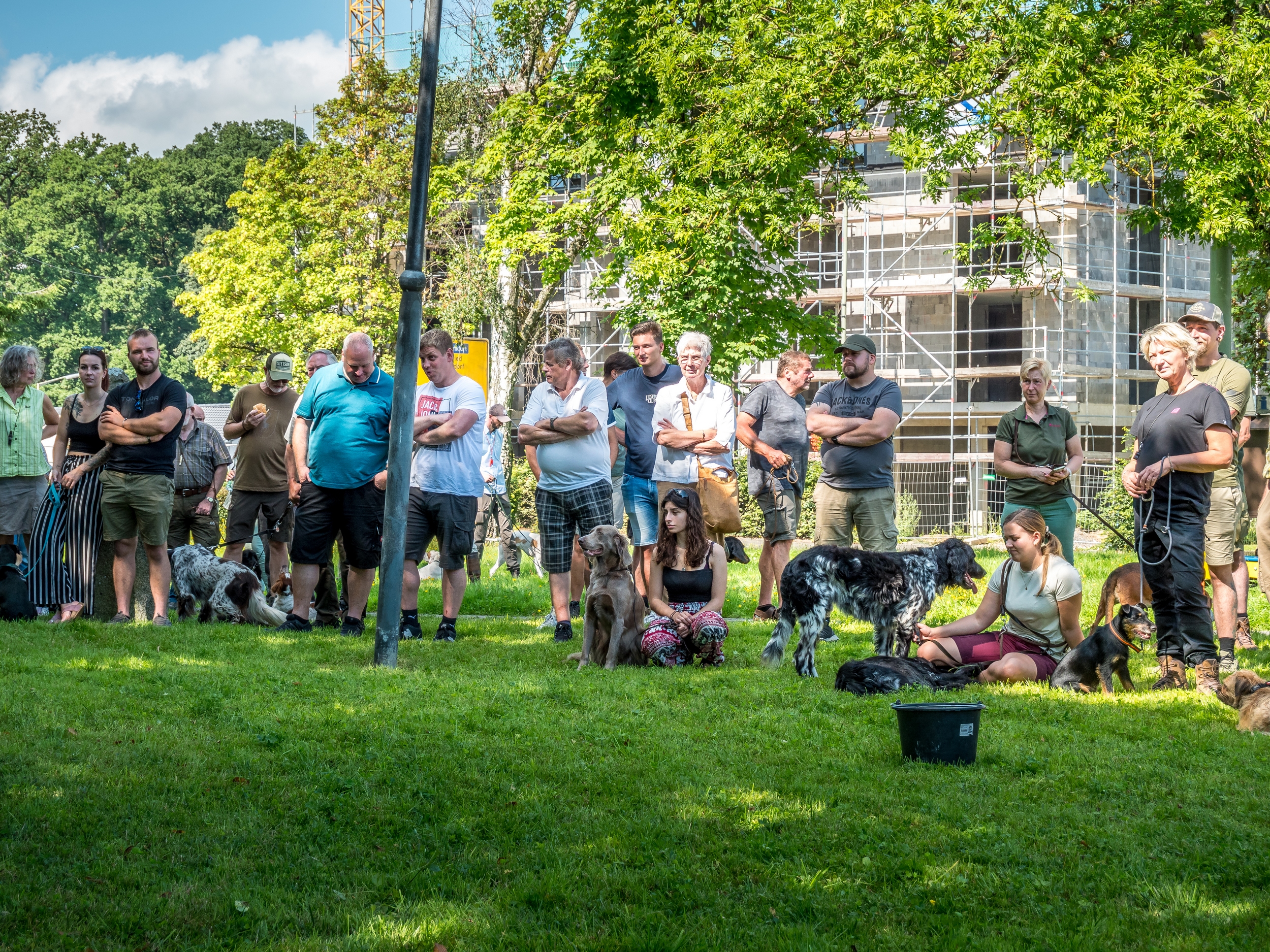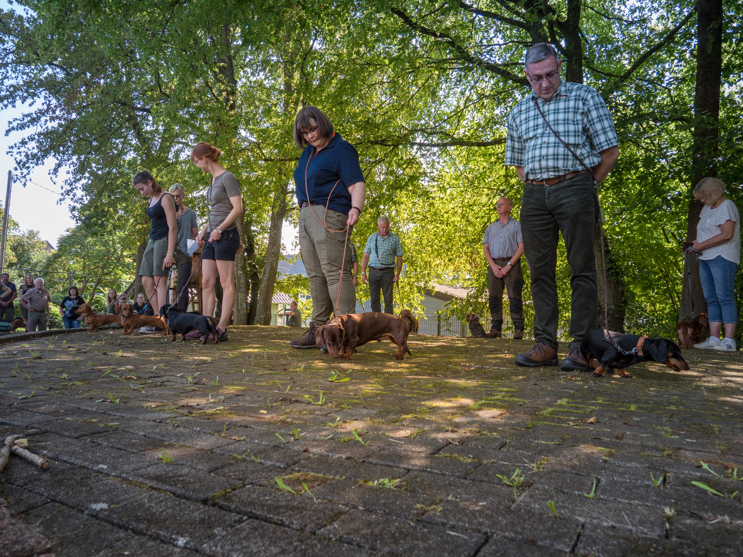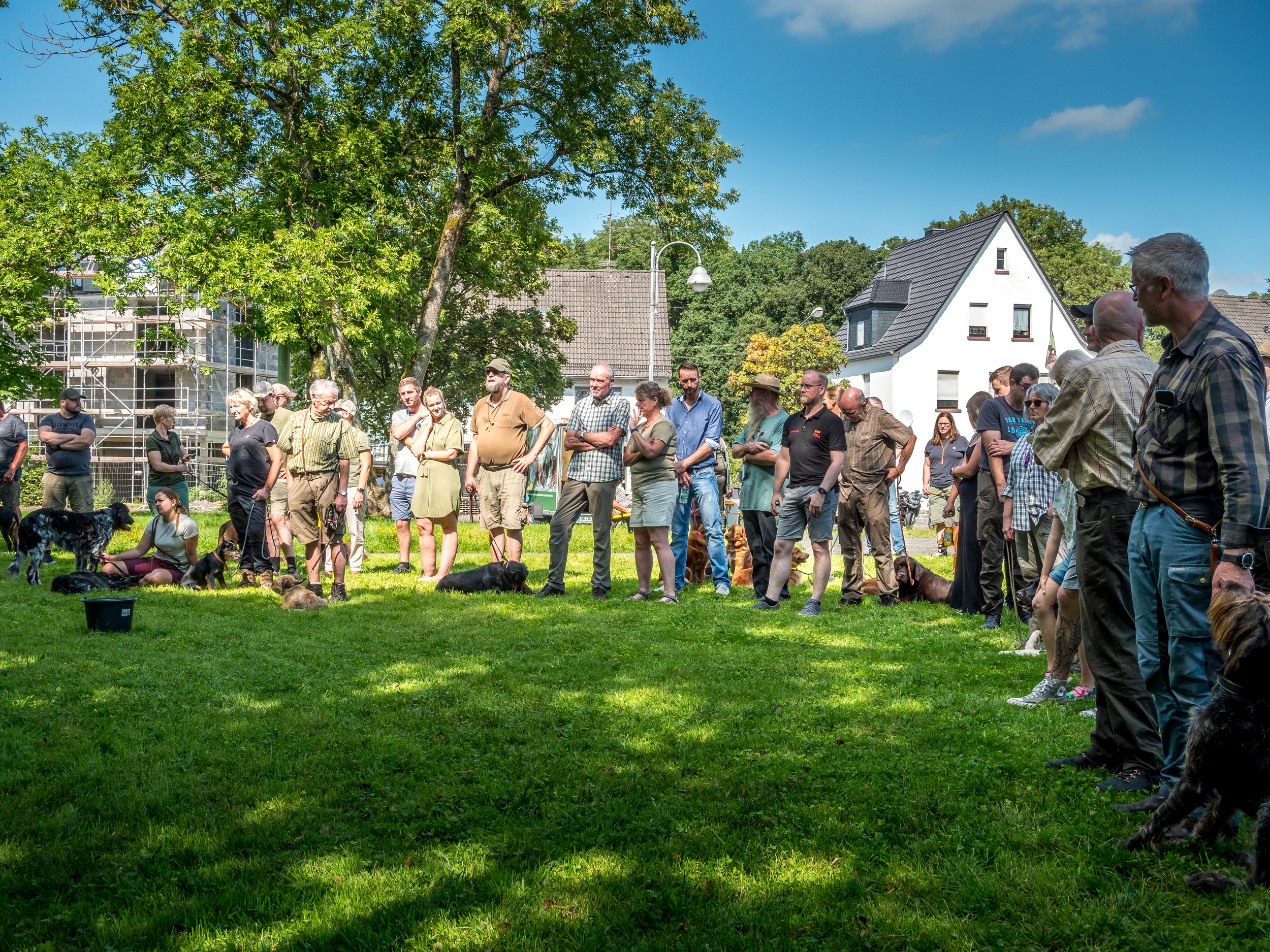 Bei der Pfostenschau 2023 am Bürgerhaus in Flammersfeld konnte die Kreisgruppe Altenkirchen e. V. bei einem Anwärterseminar das breite Spektrum der Jagdhunderassen präsentieren. Nach der Begrüßung durch den Kreisjagdmeister Jörg Wirths, den Vorsitzenden der Kreisgruppe Dr. Karl-Heiner Nöllgen sowie den Stellvertreter Frank Fischer, wurden über 50 Jagdhunde von ihren Hundeführern über die Naturbühne im Schatten der Bäume geführt, sortiert nach den speziellen Einsatzgebieten. Jede Gruppe hatte einen eigenen Moderator, der Wissenswertes über die gezeigte Jagdhunderasse berichtete. Für die erschienenen Jägerprüfungsanwärter und interessierten Hundefreunde war das eine sehr informative Veranstaltung, die durch die Walderlebnisschule mit zahlreichen Wildtierpräparaten ergänzt wurde. Die Bläsergruppe des Hegerings Altenkirchen sorgte für einen ansprechenden jagdmusikalischen Rahmen der Veranstaltung.